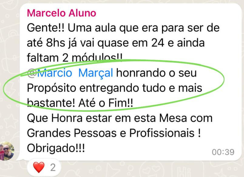 Durante a sessão de mentoria, o Marcio Marçal pega todas as dúvidas dos participantes presentes e entrega as resoluções na hora, para todos e ao vivo. É um trabalho extremamente importante para facilitar ainda mais a sua compressão de tudo e alavancar os seus resultados.