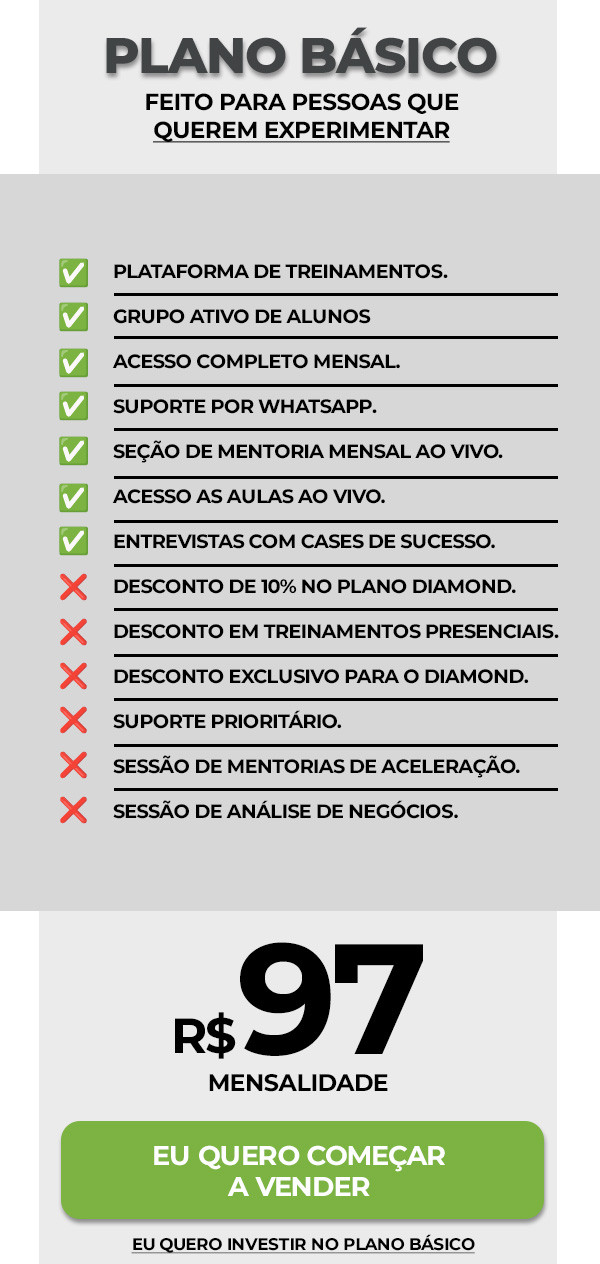 O Plano Básico foi criado para pessoas que querem experimentar a Escola de Vendas Digitais. E a vantagem dele é você poder começar com o investimento mensal, sem comprometer o cartão de crédito ou se descapitalizar em caso da falta de recursos necessários para investir no Plano Completo. É uma opção para quem precisa faturar e tem pouco para investir.